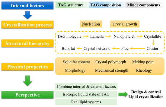 The objective of this review is to offer a comprehensive summary of the internal factors, such as TAG structure (i.e., fatty acid structure and symmetrical/asymmetrical structures of TAG), TAG composition, and minor components, on lipid crystallization at different structural hierarchy levels and the resulting physical properties of the lipid system. Future perspectives on how various factors influence lipid crystallization, and thus on achieving a better design and control of lipid crystallization, are discussed (Figure 1).