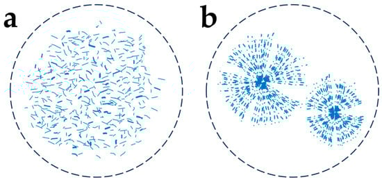 Graphical representation of crystal morphology of milk fat. (a) High concentration of high-melting-point TAG. (b) Low concentration of high-melting-point TAG.