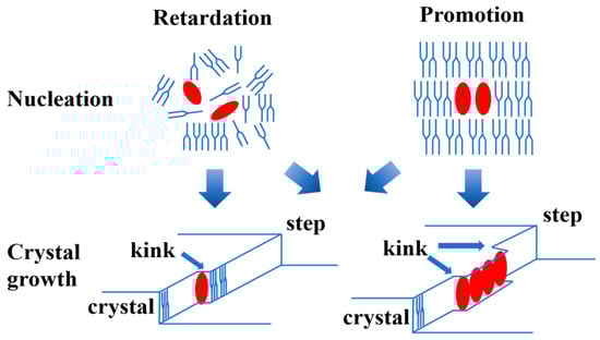 The influence of minor components on various aspects of crystallization cannot be underestimated. The general effects of minor components on nucleation and crystal growth are depicted in Figure 3. Nucleation is hindered if the minor component disrupts crystal nucleus formation, but promoted if it acts as a template. Crystal growth is impeded if the minor components hinder the attachment of TAG molecules at the kink sites, yet facilitated if they create new kink sites at the molecular step [3]. The interaction between minor components and the bulk lipid determines the influence of minor components on lipid crystallization [10]. Additionally, the path of lipid crystallization and the resulting physical properties, such as spreadability and hardness, depend on the interaction of these components [71]. Despite extensive research on this topic, ongoing studies continue due to the diverse materials influencing this process and the increasing interest in the nanostructure of lipid crystals.