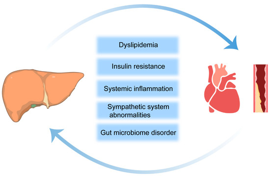 Over the past 30 years, there have been many new insights into the pathogenesis of NAFLD. There is a partial relationship of the etiology between NAFLD and CVD, and the most common cause of death in patients with NAFLD is CVD rather than chronic liver disease [36]. The precise pathophysiological mechanisms that elevate the CVD risk in the context of NASH/NAFLD are yet to be fully elucidated. However, current evidence points to a constellation of potential factors, including dyslipidemia, insulin resistance (IR), systemic inflammation, coagulopathies, anomalies within the sympathetic nervous system, and perturbations in the gut microbiome. Among these, dyslipidemia, IR, and systemic inflammation stand out as conventional risk factors for CVD and as being independent of NASH/NAFLD in terms of exacerbating the CVD risk (Figure 1) [37].