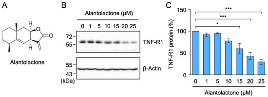 Alantolactone down-regulated the expression of TNF-R1 in A549 cells. (A) Structure of alantolactone. (B,C) A549 cells were treated with alantolactone for 1 h at the concentrations indicated in the figure panels. Western blotting was used to assess the protein levels in the cell lysates. Blots are representative of three independent experiments (B). The amount of TNF-R1 protein was normalized to the amount of β-actin protein. The level of TNF-R1 protein (%) (C) is shown as the mean ± standard error of three independent experiments * p < 0.05 and *** p < 0.001. Original blots are shown in Supplementary Figures S1–S4.