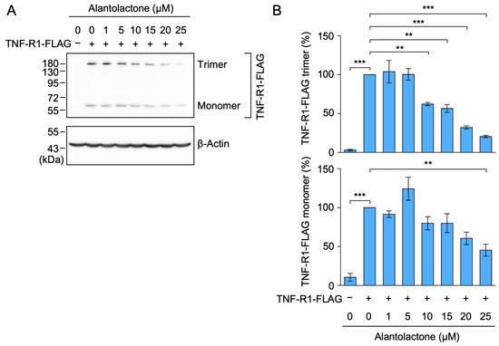 Alantolactone down-regulated the expression of transfected TNF-R1 in A549 cells. (A,B) A549 cells were left untreated (−) or transfected with an expression vector encoding FLAG-tagged TNF-R1 (+) for 24 h. A549 cells were treated with alantolactone for 1 h at the concentrations indicated in the figure panels. Western blotting was used to assess the protein levels in the cell lysates. Blots are representative of three independent experiments (A). The amount of TNF-R1-FLAG protein in the cell lysates was normalized to the amount of β-actin protein. The levels of TNF-R1-FLAG monomers (%) and TNF-R1-FLAG trimers (%) are shown as the mean ± standard error of three independent experiments (B). ** p < 0.01 and *** p < 0.001. Original blots are shown in Figures S17–S20.