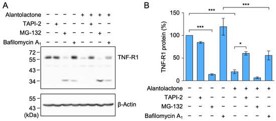 TAPI-2 suppressed the down-regulation of TNF-R1 expression by alantolactone in A549 cells. (A,B) A549 cells were pretreated without (−) or with (+) TAPI-2, MG-132, or bafilomycin A1 for 1 h, and were then treated without (−) or with (+) alantolactone (25 µM) in the absence (−) or presence (+) of TAPI-2 (25 µM), MG-132 (20 µM), or bafilomycin A1 (100 nM) for 1 h at the indicated final concentrations. Blots are representative of three independent experiments (A). The amount of TNF-R1 protein was normalized to the amount of β-actin protein. The levels of TNF-R1 protein (%) in the cell lysates are shown as the mean ± standard error of three independent experiments (B). * p < 0.05 and *** p < 0.001. Original blots are shown in Figures S21–S24.