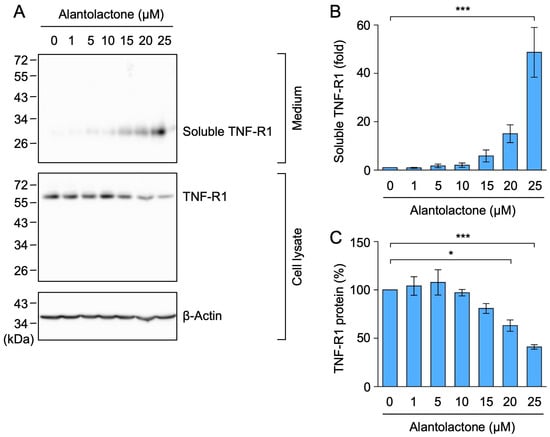 Alantolactone promoted the ectodomain shedding of TNF-R1 in A549 cells. (A–C) A549 cells were treated with alantolactone for 1 h at the concentrations indicated in the figure panels. Blots are representative of three independent experiments (A). The amount of TNF-R1 protein was normalized to the amount of β-actin protein. The levels of soluble TNF-R1 protein (fold) (B) in the culture medium and TNF-R1 protein (%) (C) in the cell lysates are shown as the mean ± standard error of three independent experiments. * p < 0.05 and *** p < 0.001. Original blots are shown in Figures S25–S28.