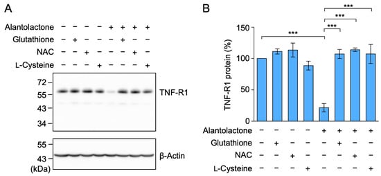 TNF-R1 shedding promoted by alantolactone was suppressed by glutathione, NAC, and L-cysteine in A549 cells. (A,B) A549 cells were pretreated without (−) or with (+) glutathione, NAC, and L-cysteine for 1 h, and were then treated without (−) or with (+) alantolactone (25 µM) in the absence (−) or presence (+) of glutathione (10 mM), NAC (10 mM), and L-cysteine (2 mM) at the indicated final concentrations for 1 h (A,B). Blots are representative of three independent experiments (A). The amount of TNF-R1 protein was normalized to the amount of β-actin protein. The level of TNF-R1 protein (%) in the cell lysates is shown as the mean ± standard error of three independent experiments (B). *** p < 0.001. Original blots are shown in Figures S29–S32.
