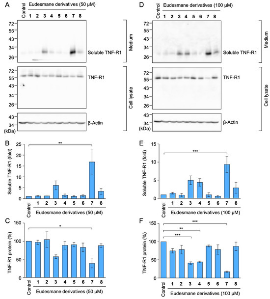 Eudesmane derivatives with an α-methylene-γ-lactone moiety promoted TNF-R1 shedding in A549 cells. (A–F) A549 cells were treated without (Control) or with 1–8 at 50 µM (A–C) or 100 µM (D–F) for 1 h at the indicated final concentrations. Blots are representative of three independent experiments (A,D). The amount of TNF-R1 protein was normalized to the amount of β-actin protein. The levels of soluble TNF-R1 protein (fold) in the culture medium (B,E) and TNF-R1 protein (%) in the cell lysates (C,F) are shown as the mean ± standard error of three independent experiments. * p < 0.05, ** p < 0.01 and *** p < 0.001. Original blots are shown in Figures S33–S40.