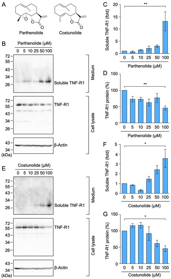 Parthenolide and costunolide promoted TNF-R1 shedding in A549 cells. (A) Structures of parthenolide and costunolide. (B–G) A549 cells were treated with parthenolide (B–D) and costunolide (E–G) for 1 h at the concentrations indicated in the figure panels. Blots are representative of three independent experiments (B,E). The amount of TNF-R1 protein was normalized to the amount of β-actin. The levels of soluble TNF-R1 protein (fold) in the culture medium (C,F) and TNF-R1 protein (%) in the cell lysates (D,G) are shown as the mean ± standard error of three independent experiments. * p < 0.05 and ** p < 0.01. Original blots are shown in Figures S41–S48.