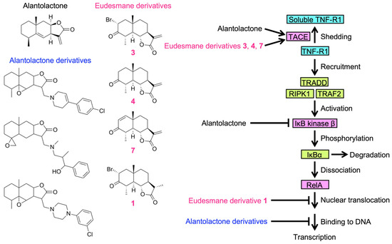 Proposed mechanisms of action of eudesmane-type sesquiterpene lactones on the TNF-α-induced NF-κB signaling pathway. Structures of alantolactone, alantolactone derivatives, and eudesmane derivatives are presented. TNF-R1 is cleaved to its soluble forms by TACE and released into the culture medium. Upon binding to TNF-α, TNF-R1 recruits TRADD, RIPK1, and TRAF2 to form the membrane-proximal complex, which activates IκB kinase β by phosphorylating serines 177 and 181 in the activation loop. In the cytoplasm, phosphorylated IκBα is ubiquitinated and degraded by the proteasome. Upon dissociation from IκBα, NF-κB subunits, including RelA, translocate to the nucleus and bind to the κB sites of target genes, initiating their transcription. Based on the present and previous studies, the mechanisms of action of eudesmane-type sesquiterpene lactones on the TNF-α-induced NF-κB signaling pathway are proposed as follows: (1) Alantolactone promotes the TACE-dependent shedding of TNF-R1, thereby down-regulating the expression of cell-surface TNF-R1 (this study). (2) Alantolactone inhibits IκB kinase β by interacting with the ATP-binding site [29]. (3) Three alantolactone derivatives inhibit RelA binding to DNA, but not its nuclear translocation [30]. (4) Eudesmane derivatives 3, 4, and 7 promote the ectodomain shedding of TNF-R1 and thereby down-regulate the expression of cell-surface TNF-R1 (this study). (5) Eudesmane derivative 1 inhibits RelA translocation to the nucleus [54].
