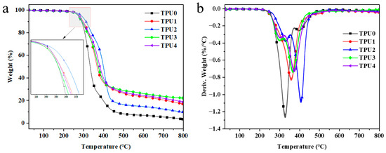 TGA (a) and DTG (b) curves of TPU and TPU composites.