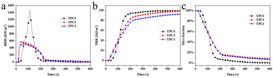 (a) HRR, (b) THR and (c) weight loss ratio curves of TPU and TPU composites.