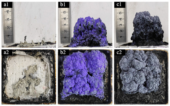 The macroscopic morphology of residual carbon after cone calorimetry testing is illustrated in Figure 8, showing the residual carbon of TPU and its composite materials. In the image, pure TPU is shown to have burned completely with minimal residual carbon, while the addition of Co@CPA to TPU composite materials containing ODOPB and SiO2 resulted in a significant increase in residual carbon thickness post cone calorimetry testing. Figure 8b1,b2 demonstrate that the residual carbon of TPU3 composite material, with a 1:1 ratio of ODOPB addition, is coated with a blue substance on the surface, identified as CoSiO3, indicating a synergistic effect between ODOPB, SiO2 and Co@CPA during TPU combustion. On the other hand, Figure 8c1,c2 reveal that TPU4 composite material, with a 1:2 ODOPB addition ratio, exhibits a denser and harder residual carbon layer post-combustion, acting as an effective physical barrier to heat, oxygen, and combustible gases within the TPU matrix for improved flame retardancy.