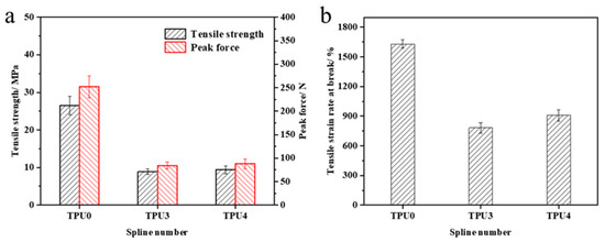 Mechanical properties of TPU and TPU composites (a) Tenslle strength, (b) Tenslle strain rate at break.