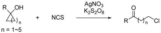 - Huang, F.-Q.; Xie, J.; Sun, J.-G.; Wang, Y.-W.; Dong, X.; Qi, L.-W.; Zhang, B. Regioselective Synthesis of Carbonyl-Containing Alkyl Chlorides via Silver-Catalyzed Ring-Opening Chlorination of Cycloalkanols. Org. Lett. 2016, 18, 684–687. [Google Scholar] [CrossRef] [PubMed]