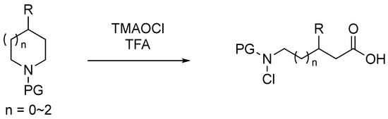 - Kaieda, Y.; Yamamoto, K.; Toguchi, H.; Hanazawa, N.; Kuriyama, M.; Onomura, O. Oxidative C–N Bond Cleavage of Cyclic Amines with Ammonium Hypochlorite. Synthesis 2023, eFirst. [Google Scholar] [CrossRef]