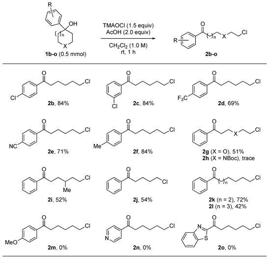 We started the initial study with the use of 1-phenylcyclohexanol (1a) as a model substrate (Table 1). When 1a (0.5 mmol) was treated with TMAOCl (1.5 equiv) and 35% HCl aq. (1.5 equiv) in CH2Cl2 at room temperature for 1 h, the desired ω-chloroalkyl aryl ketone 2a was obtained in 47% yield (Table 1, entry 1). Among a series of acids tested, AcOH provided a superior result (entries 1–5). We further optimized the reaction conditions, and 2a was obtained in a higher yield by employing 2.0 equiv of AcOH (entry 6). The yield of 2a slightly decreased with the use of 2.25 equiv of AcOH (entry 7), and the use of 2.0 equiv of TMAOCl and AcOH led to an obvious decrease in yield (entry 8). When the reactions were carried out at higher reaction concentrations, the reaction outcomes were not affected (entries 9 and 10), and 2a was isolated in 83% yield (entry 10). Extending the reaction time did not improve the yield of 2a (entry 11). Other solvents such as ClPh, AcOEt, and MeCN were less suitable for the reaction, providing 2a in lower yields (entries 12–14). A commercially available NaOCl·5H2O was found to be a less effective oxidant for this ring-opening reaction (entry 10 vs. entry 15). The addition of Me4NCl exhibited a positive effect on the reaction outcome [38,39], but the yield was slightly low, even with 2.0 equiv of NaOCl·5H2O, compared with that obtained from TMAOCl (entry 10 vs. entries 16 and 17). On the other hand, the reaction did not proceed well without an acid (entry 18). The reaction under the N2 atmosphere provided 2a in 77% yield, indicating that the presence of oxygen did not have a significant effect on the reaction outcome (entry 19) [40].