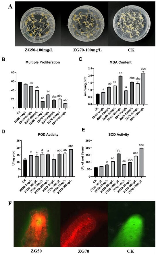 The stressing of different polarities of ginsenoside components on ginseng hairy roots: apparent morphology (A); the results of multiple proliferation (B); MDA content (C); POD activity (D); SOD activity (E); apical cell viability (F). Significant compared with CK group (a), compared of different concentrations within groups (b), and between ZG50 and ZG70 groups under the same concentration (c).
