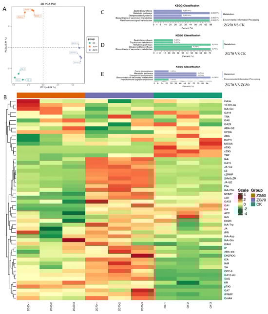The PCA plot (A), HCA heatmap (B), and KEGG classification (C–E) of phytohormones and their metabolites.