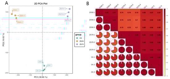 To recognize the key factors of the transcriptome data, PCA was used to demonstrate the changes in ZG50, ZG70, and CK (Figure 3A). The PCA results showed that the first two principal components (PC1, PC2) could clearly distinguish these three groups. In addition, Pearson’s correlation coefficient was used as an assessment indicator of biological repetition correlation. The closer the absolute value of r is to 1, the stronger the similarity of duplicate samples. From the sample correlation plot (Figure 3B), the similarity between biological replicates within the same group was high, which indicated good reproducibility of the ZG50, ZG70, and CK samples.