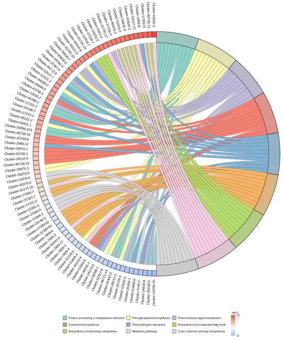 As shown in Figure 4, for the ZG70 vs. ZG50 group, 145 metabolic pathways associated with differential genes were mainly involved in protein processing in endoplasmic reticulum, phytohormone signal transduction, biosynthesis of phenylpropanoid, carotenoid, unsaturated fatty acids, cutin, suberine, wax and secondary metabolites, metabolic pathways, plant–pathogen interaction, etc. The protein processing in endoplasmic reticulum, phytohormone signal transduction, and phenylpropanoid biosynthesis pathways was more significantly differently expressed in the ZG70 and ZG50 groups, which drove the occurrence of autotoxicity.