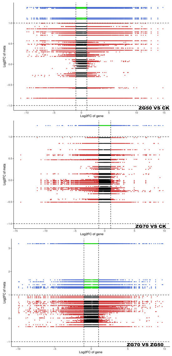 Nine-quadrant plots of correlation analysis of differential genes and phytohormones for ZG50 vs. CK, ZG70 vs. CK, and ZG70 vs. ZG50 groups. With a black dashed line, from left to right, from top to bottom, successively divided into 1–9 quadrants. The 5 quadrant represents both non-differentially expressed genes and metabolites. The 3 and 7 quadrants represent genes consistent with the differential expression patterns of the metabolites, namely that the expression changes of the metabolites may be positively regulated by the genes. The 1 and 9 quadrants represent genes with opposite differential expression patterns with metabolites, namely that the expression changes of metabolites may be negatively regulated by the genes. The 2, 4, 6, and 8 quadrants represent metabolites with no correlation with genes changes.