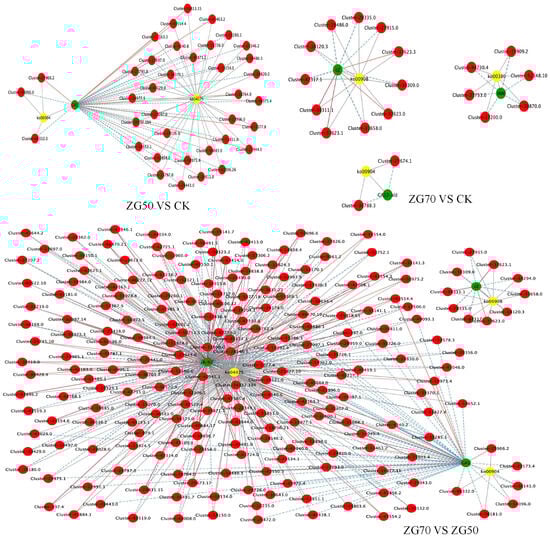 To further explore the molecular mechanism of the occurrence and development of allelopathy driving by different polar ginsenoside components, the relationship between significantly different phytohormone metabolites and expressed genes of ZG50 vs. CK, ZG70 vs. CK, and ZG70 vs. ZG50 groups was investigated. The integrated analysis was performed based on the differential phytohormone metabolites and genes screened out as shown below (Table 2). The differential genes and phytohormones with a Pearson’s correlation coefficient greater than 0.80 and p value less than 0.05 in each pathway were selected for correlation analysis, which were displayed in nine-quadrant plots (Figure 6). According to KEGG pathway maps, metabolic pathways and the biosynthesis of secondary metabolites were overview pathways, and the metabolites and genes could not be viewed. Therefore, the correlation networks of the other pathways are shown in Figure 7.