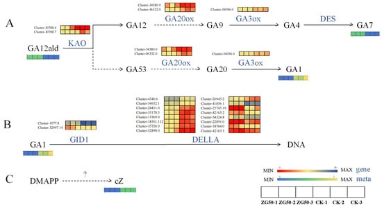 The pathway heatmaps of differential genes and phytohormones for ZG50 vs. CK group. (A) Diterpenoid biosynthesis pathway. (B) Phytohormone signal transduction pathway. (C) Zeatin biosynthesis pathway.