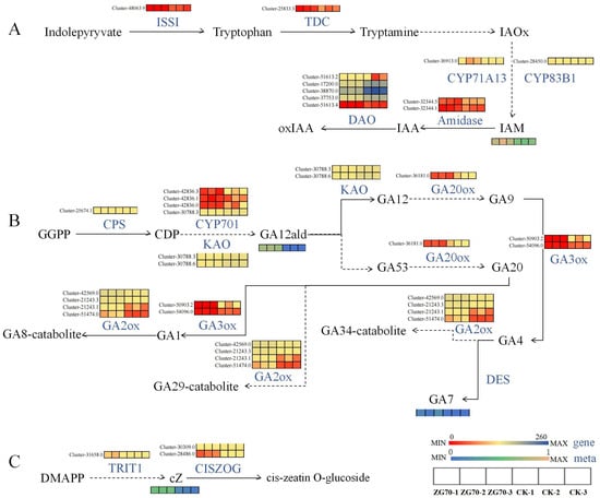 The pathway heatmaps of differential genes and differential metabolites for ZG70 vs. CK group. (A) Tryptophan metabolism pathway. (B) Diterpenoid biosynthesis pathway. (C) Zeatin biosynthesis pathway.