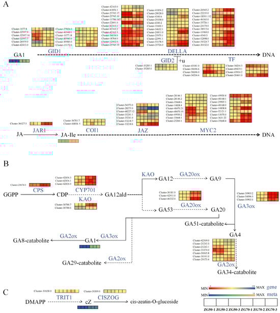 The pathway heatmaps of differential genes and differential metabolites for ZG70 vs. ZG50 group. (A) Hormone signal transduction pathway. (B) Diterpenoid biosynthesis pathway. (C) Zeatin biosynthesis pathway.