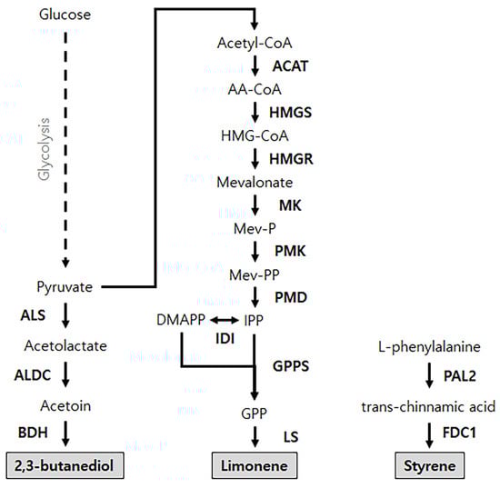 Utilization of cell-free synthesis systems for prototyping metabolic pathways. This figure showcases several examples in which cell-free synthesized enzymes are harnessed to evaluate and optimize designed metabolic pathways aimed at producing valuable chemical compounds. Highlighted are specific case studies where cell-free systems were used to prototype pathways for the synthesis of 2,3-butanediol, limonene, and styrene, illustrating the versatility and efficacy of cell-free synthesis in facilitating the rapid testing and development of novel biochemical pathways for the production of industrially relevant compounds. ALS, acetolactate synthase; ALDC, acetolactate decarboxylase; BDH, 2,3-butanediol dehydrogenase; ACAT, acetyl-CoA acetyltransferase; HMGS, hydroxymethylglutaryl-CoA synthase; HMGR, hydroxymethylglutaryl-CoA reductase; MK, mevalonate kinase; PMK, phosphomevalonate kinase; PMD, pyrophosphomevalonate decarboxylase; IDI, isopentenyl pyrophosphate isomerase; GPPS, geranyl diphosphate synthase; LS, limonene synthase; PAL2, phenylalanine ammonia lyase; FDC1, ferulic acid decarboxylase [34,35,36].