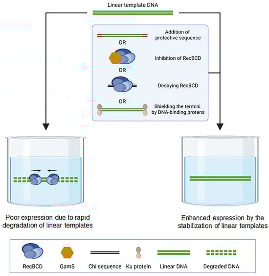 - Yim, S.S.; Johns, N.I.; Noireaux, V.; Wang, H.H. Protecting Linear DNA Templates in Cell-Free Expression Systems from Diverse Bacteria. ACS Synth. Biol. 2020, 9, 2851–2855. [Google Scholar] [CrossRef] [PubMed]