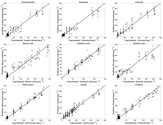 The criterion defined by Shenk and Westerhaus (1996) proposes that an R2 greater than 0.90 indicates “excellent” regression models capable of quantitative determinations [22]. According to this criterion, all developed models (especially the ones for ethyl acetate (R2P = 0.98), furfural (R2P = 0.97), acetoin (R2P = 0.96) and 1-hexanol (R2P = 0.96)) are remarkably capable of quantitative predictions. It is also worth noting that all predictive errors represent less than 10% of their respective concentration ranges. Regarding the RER parameter, when RER is higher than 4, the model can be used for screening; when it exceeds 10, the model can be employed for quality control; and when higher than 15, the model is considered very good for research quantification [23]. As for the RPD parameter, when its value ranges from 2.0 to 2.5, the model can be used for approximate quantifications; between 2.5 and 3.0, the developed models can be classified as good; and when exceeding 3.0, the developed models can be considered excellent [24].