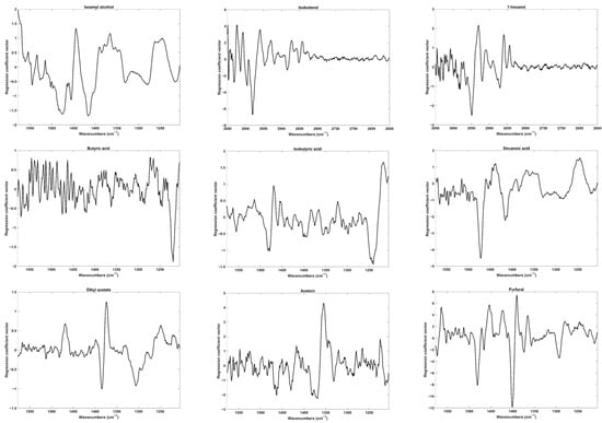 The mid-infrared spectrum of wine is primarily dominated by intense water and ethanol absorption bands. These absorption bands pose a major limitation in determining higher alcohols. Additionally, the chemical similarity between wine constituents results in similar absorption features, further complicating the determination of minor compounds. The overlapped absorptions, typical in the FTIR spectra of wine, hinder direct interpretation and the observed peaks or bands cannot be assigned to individual compounds. Therefore, the plot of the regression coefficient vectors, as shown in Figure 2, serves as an alternative to support the selection of the most contributive regions for each compound.
