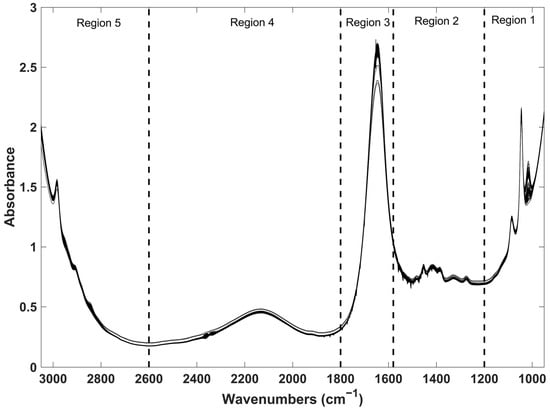 A detailed exploratory analysis is frequently required when working with FTIR spectra to locate spectral regions encompassing the variation capable of providing useful results for each specific demand. A simple visual analysis of FTIR spectra led to the exclusion of the regions below 3050 cm−1 and above 950 cm−1. The remaining spectral section was subdivided into five spectral regions in agreement with the disposition of its peaks and/or bands (Figure 3). The five regions individually, as well as all their possible combinations (a total of 31 possibilities), were considered in the development of each compound’s calibration with the objective of ensuring an exhaustive investigation of the whole spectral range. Undesirable spectral variations generated by temperature variations, light scattering effects and baseline drifts may limit the proper use of the spectral data. Therefore, preprocessing techniques capable of reducing these undesirable effects were employed. Raw spectra were treated with standard normal variate (SNV) and/or Savitzky–Golay (with 15 points of filter width, second polynomial order) first- and second-order derivatives (individually or combined). SNV is commonly applied to remove scatter effects and to improve the signal-to-noise ratio by subtracting the spectra at each point from the average spectrum and then dividing by the respective standard deviation [29]. The Savitzy–Golay method is commonly applied to reduce the noise, improve the signal-to-noise ratio and correct for baseline variations. It basically finds the derivative of the spectrum via a smooth process, according to the window size selected (known as points of filter width) and polynomial degree order [30].