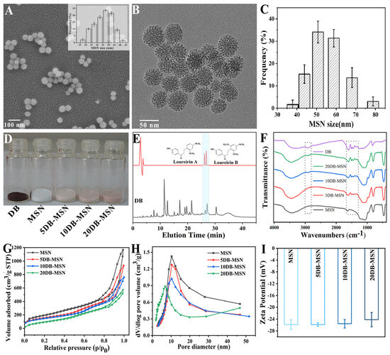 The incorporation of DB and MSNs was qualitatively confirmed by FT-IR spectra. As shown in Figure 1F, MSNs displayed a typical FT-IR spectrum of mesoporous silica [19]. The peaks at 3430 cm−1 were due to the stretching vibrational frequency of the silanol groups. Two bands of CH2 stretching were observed at 2933 cm−1 and 2871 cm−1. The vibrations associated with the hydrogen bond of n(–OH) in physisorbed water molecules and n(–Si–OH) in free silanol were observed at 1634 cm−1 and 954 cm−1, respectively. The spectral peaks at 1084 cm−1, 800 cm−1, and 465 cm−1 were assigned to Si–O–Si asymmetric stretching vibration, symmetric stretching vibration, and bending vibration. In the FT-IR spectrum of DB, the characteristic peaks at 1600 cm−1, 1510 cm−1, and 1452 cm−1 were consistent with aromatic C–C stretches, which originated from corresponding to the benzene rings of the main components of DB, flavonoids [21]. For DB-MSN, the characteristic peaks of DB could be observed at 1600 cm−1, 1510 cm−1, and 1452 cm−1, which suggested the successful deposition of DB on the MSN.