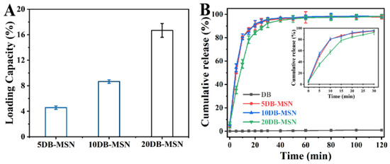 (A) Loading capacity of DB-MSN. (B) DB-release behaviors of DB-MSN in PBS solution.