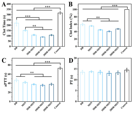 Analysis of hemostatic efficiency in vitro. (A) CT results for the control, DB, MSNs, and DB-MSN. (B) CI results for the control, DB, MSNs, and DB-MSN. (C) APPT results for the control, DB, MSNs, and DB-MSN. (D) PT results for the control, DB, MSNs, and DB-MSN. These data are represented as the mean ± SD (n = 3). (**, p < 0.01; ***, p < 0.001).