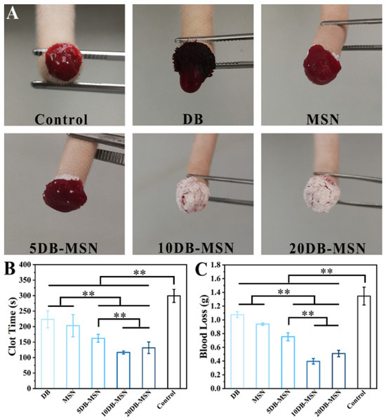 Clotting time (CT) is an intuitive method to evaluate the hemostatic properties of DB-MSN. As shown in Figure 4A, the CTs of the DB group (220.33 ± 25.95 s) and the MSN group (151.33 ± 7.41 s) were significantly shorter than the control group (316.33 ± 7.41 s), indicating that both DB and MSNs can effectively promote blood coagulation [14,25]. The CT of 5DB-MSN, 10DB-MSN, and 20DB-MSN were approximately 108.33 ± 6.23 s, 89.67 ± 2.05s, and 107.33 ± 6.55s, respectively, faster than that of MSNs and DB. The 10DB-MSN showed a shorter CT than the 20DB-MSN; this phenomenon may be related to the higher release rate of 10DB-MSN than 20DB-MSN at the initial stage. The clotting index (CI) with scientific rationality was also used to evaluate the hemostatic efficiency (Figure 4B). Compared to the control group (set to 100%), the CI of DB and MSNs were 59.39 ± 3.29% and 55.56 ± 1.57%, respectively. DB-MSN showed a smaller CI than DB and MSN, and the CIs of 5DB-MSN, 10DB-MSN, and 20DB-MSN were 44.92 ± 1.44%, 40.81 ± 1.68%, and 47.47 ± 1.57%, respectively. The CI results were consistent with the CT results. Overall, the DB-MSN performed better hemostatic efficiency than pure DB or MSN, and the performance of the 10DB-MSN was optimal.