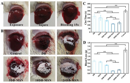 Mesoporous silica nanoparticles (MSNs) are a potential hemostasis material because of their good adsorption capacity and the high surface concentration of negative net charges and silanol groups [17]. In addition, they are easy to functionalize with many kinds of clotting molecules including metal ions, small organic molecules, and proteins. Functionalized MSNs have been developed for various applications, including increasing antibacterial activity, improving hemostatic performance, and improving biocompatibility [18,19,20]. For example, polyphosphate-functionalized silica nanoparticles were more potent than bare silica nanoparticles at promoting coagulation [18]. Tannic acid-loaded MSNs exhibited better antibacterial activities and could reduce the hemostatic time by 65% [19]. MSNs were coordinated with a glycerol-modified N-alkylated chitosan sponge to develop a rapid hemostatic agent with minimal side effects [20]. These functionalized MSNs had excellent hemostatic effects. However, to the best of our knowledge, no DB-loaded MSNs for hemostasis have been reported.