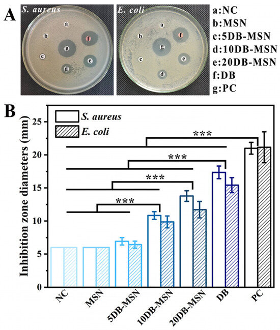 The antibacterial activity of hemostatic material is an essential factor in wound healing after hemostasis. To evaluate the antibacterial performance of DB-MSN, the inhibition zones of different samples for S. aureus (Gram-positive bacteria) and E. coli (Gram-negative bacteria) were tested. As shown in Figure 7A,B, inhibition zones around blank paper (No. a sample) and MSN-coated paper (No. b sample) were not observed, which indicated blank paper and MSNs were devoid of antimicrobial activity. A narrow inhibition zone over the 5DB-MSN-coated paper (No. c sample) against S. aureus and E. coli was 6.9 ± 0.6 mm and 6.4 ± 0.5 mm, respectively. Compared to that of the 5DB-MSN-coated paper, the inhibition zone of the 10DB-MSN-coated paper (No. d sample) and 20DB-MSN-coated paper (No. e sample) against S. aureus and E. coli significantly increased 10.8 mm and 9.86 mm, 13.8 mm and 11.7 mm, respectively. It can be observed that clear inhibition zones were formed by increasing the DB concentration of the DB-MSN. DB-coated paper (No. f sample) demonstrated good antibacterial levels against S. aureus and E. coli with inhibition zones of 21.0 ± 0.9 mm and 17.4 ± 1.0 mm, respectively. The positive control groups, streptomycin-coated paper (No. g sample), demonstrated good antibacterial levels against S. aureus and E. coli (inhibition zones of 21.0 ± 0.9 mm and 17.4 ± 1.0 mm, respectively). The minimal inhibitory concentration (MIC) results of DB-MSN (Table S1) showed a similar trend as the inhibition zone results; the inhibitory activity of DB-MSN increased with the amount of DB. These results demonstrated that DB-MSN displayed good antibacterial activity, and their antibacterial activity was related to the amount of DB. The antibacterial activity of the DB-MSN could be attributed to the active ingredient DB released from the DB-MSN, which can reduce the biofilm formation of bacteria [26].