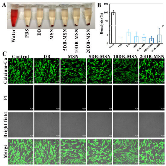 Biocompatibility analysis. (A) Hemolysis photograph of the control, DB, MSNs, and DB-MSN. (B) Hemolysis ratio of the control, DB, MSNs, and DB-MSN. Values correspond to the mean ± SD (n = 3). (C) Live/dead staining of cells incubated with the control, DB, MSNs, and DB-MSN. The sample concentrations were all 0.64 mg/mL. Scale 50 μm.