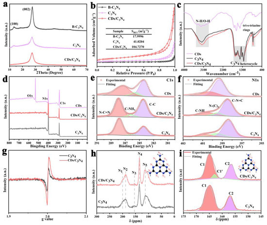 (a) XRD patterns of CDs/C3N4, C3N4, B-C3N4. (b) Nitrogen adsorption desorption isotherms of CDs/C3N4, C3N4, B-C3N4; (c) FT-IR spectra of CDs, CDs/C3N4, and C3N4; (d) XPS survey spectrum of CDs, C3N4, and CDs/C3N4. (e) C1s and (f) N1s XPS spectra of CDs, CDs/C3N4, and C3N4. (g) EPR spectra, (h) 15N and (i) 13C NMR spectra of C3N4 and CDs/C3N4.