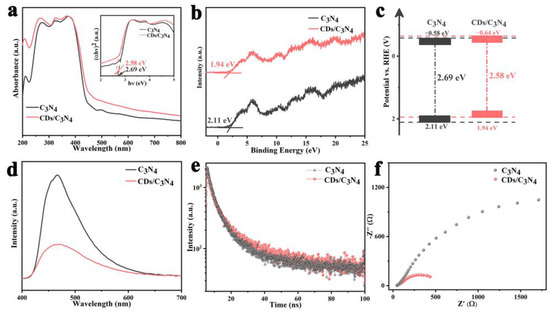 (a) UV−vis absorption spectra and (inset) corresponding band gap energies of C3N4 and CDs/C3N4; (b) XPS valence band for C3N4 and CDs/C3N4; (c) energy band diagrams of C3N4 and CDs/C3N4; (d) steady-state PL spectra (365 nmexcitation); (e) transient state photoluminescence spectra of C3N4 and CDs/C3N4; (f) EIS Nyquist plots of C3N4 and CDs/C3N4 electrodes.