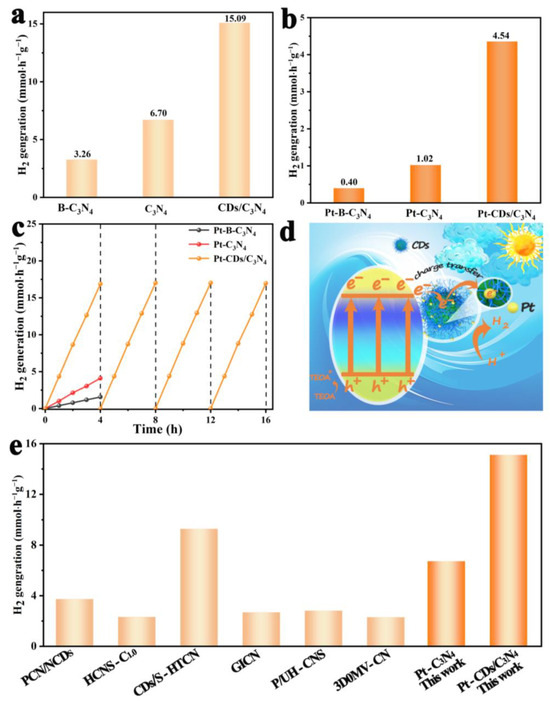(a) Photocatalytic H2 evolution rate for Pt-CDs/C3N4, Pt-C3N4, Pt-B-C3N4 using AM 1.5 illumination, (b)Photocatalytic H2 evolution rate for Pt-CDs/C3N4, Pt-C3N4, Pt-B-C3N4 using CUT 420 illumination. (c) The recycled photocatalytic measurement of CDs/C3N4 using CUT 420 illumination for H2 evolution, each of the experiments lasted 4 h, and then the catalyst was recycled and used for the next 4 h cycle, (d) Charge transfer and separation mechanism of CDs/C3N4 under visible light irradiation, (e) Photocatalytic hydrogen evolution performance for Pt-CDs/C3N4 composite in comparison with other CN-based photocatalysts (PCN/NCDs [20], HCNS-C1.0 [43], CDs/S-HTCN [44], GICN [11], P/UH-CNS [45], 3D0MV-CN [9]) that reported in recent years [9,11,20,43,44,45].