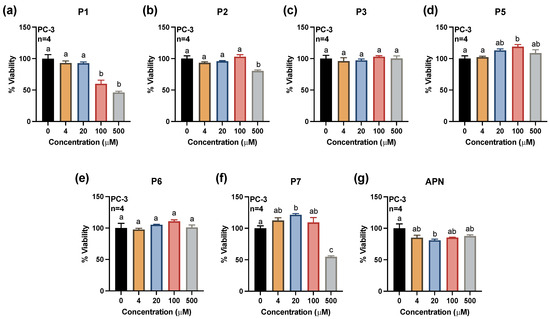 Viability of PC-3 prostate cancer cells in response to treatments with the indicated molecules. Cells were incubated in the absence or presence of increasing concentrations (0, 4, 20, 100, 500 µM) of the indicated molecules for 24 h, followed by the determination of cell viability as described in the Material and Methods Section. Results for the viability of PC-3 cells following treatments with P1 (a), P2 (b), P3 (c), P5 (d), P6 (e), P7 (f), and APN (g) are presented. The experiments were repeated four times, and the results are presented as percent cell viability over control (0 μM, DMSO only) (±SEM). Statistical comparisons were performed using a one-way ANOVA followed by a Holm-Sidak multiple comparison test, where different letters denote significant differences (p < 0.05).