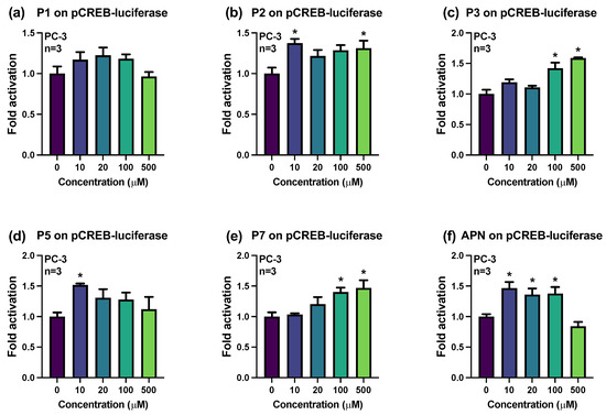 Effects of the indicated molecules on the activity of CREB transcription factors. PC-3 prostate cancer cells were transfected with a luciferase plasmid reporter harboring four consensus CREB regulatory elements upstream of the gene encoding Firefly luciferase. Cells were treated with increasing concentrations of the indicated molecules for 6 h. Results for the activation of the CREB transcription factors following treatments of PC-3 cells with P1 (a), P2 (b), P3 (c), P5 (d), P7 (e), and APN (f) are presented. Results are presented as fold activation over the control (DMSO only) (±SEM). A one-way ANOVA was used to analyze data according to the concentrations of the indicated molecules, followed by Dunnett’s multiple comparison test for significant differences compared to the control (* p < 0.05).