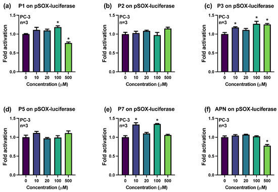 Effects of the indicated molecules on the activity of SOX transcription factors. PC-3 prostate cancer cells were transfected with a luciferase plasmid reporter harboring four consensus SOX regulatory elements upstream of the gene encoding Firefly luciferase. Cells were treated with increasing concentrations of the indicated molecules for 6 h. Results for the activation of SOX transcription factors following treatments of PC-3 cells with P1 (a), P2 (b), P3 (c), P5 (d), P7 (e), and APN (f) are presented. Results are presented as fold activation over the control (DMSO only) (±SEM). A one-way ANOVA was used to analyze data according to the concentrations of the indicated molecules, followed by Dunnett’s multiple comparison test for significant differences compared to the control (* p < 0.05).
