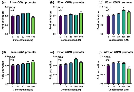 Effects of the indicated molecules on the activation of the CDH1 promoter. PC-3 prostate cancer cells were transfected with a luciferase plasmid reporter harboring the human −670 to +92 bp CDH1 promoter upstream of the gene encoding Firefly luciferase. Cells were treated with increasing concentrations of the indicated molecules for 6 h. Results for the activation of the CDH1 promoter following treatments of PC-3 cells with P1 (a), P2 (b), P3 (c), P5 (d), P7 (e), and APN (f) are presented. Results are presented as fold activation over the control (DMSO only) (±SEM). A one-way ANOVA was used to analyze data according to the concentrations of indicated molecules, followed by Dunnett’s multiple comparison test for significant differences compared to the control (* p < 0.05).