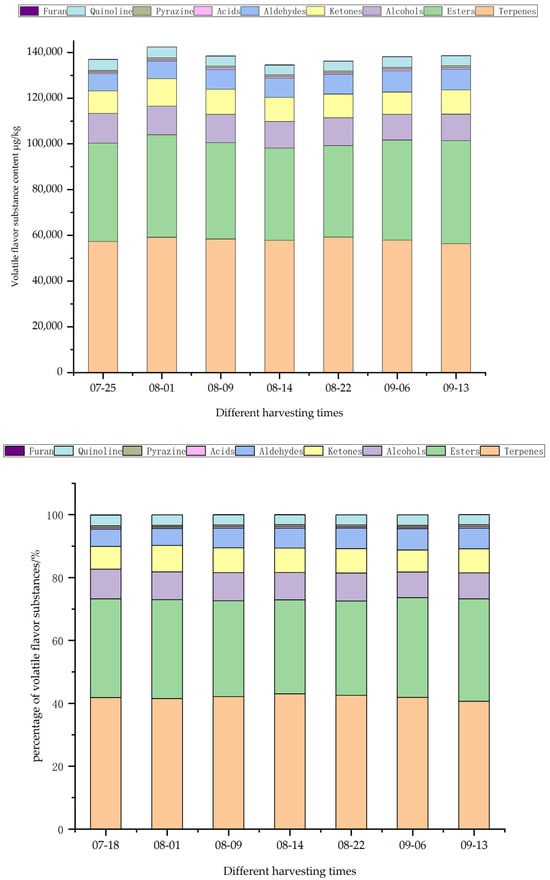 Terpene substances make up the largest proportion in Schisandra chinensis fruit, and their aroma is mainly characterized by fruity scents, including those of citrus, apple, and lemon. Among the terpenes detected, Alpha-farnesene and terpinolene contributed citrusy odors, laurene had a spice odor, beta-Ocimene had an apple odor, Beta-pinene came with a woody smell, and G-terpinene and limonene bore a lemon smell. During the seven harvesting periods, the highest terpene flavor substance content was recorded at 59,167.52 μg/kg on 22 August, followed by 59,081.87 μg/kg on 1 August, 58,333.39 μg/kg on 9 August, 57,866.47 μg/kg on 6 September, 57,795.17 μg/kg on 14 August, 57,275.49 μg/kg on 25 July, and 56,331.19 μg/kg on 13 September.