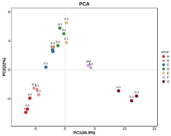 Principal component analysis is a widely used multivariate statistical analysis method. All variables identified in the sample were formed into a new set of comprehensive variables, from which 2–3 comprehensive variables were extracted to reflect the information of the original variables. The differences between the samples were assessed according to the contribution rate of the extracted comprehensive variables, visualizing the redundant data. The distance of the different groups of samples reflected the differences in the formation of the communities []. As shown in Figure 5, with 67 flavor substances detected as dependent variables and 7 harvesting dates as independent variables, multivariate statistical analysis was conducted on the volatile flavor substances of Schisandra chinensis fruit at different harvesting dates. The seven harvesting periods showed an obvious separation trend on the two-dimensional map, and a total of two principal components were extracted, with the contribution rate of PC1 being 45.9% and that of PC2 being 22%. PCA could directly reflect the difference in the flavor substance content in the Schisandra chinensis fruit between the different harvesting periods. As illustrated in the figure, the distance between fruits on 25 July and 1 August was smaller, and the distance between fruits on 13 September and other harvesting periods was greater, indicating that there were significant differences in aroma characteristics between the different harvesting periods.