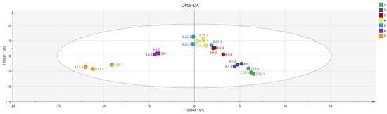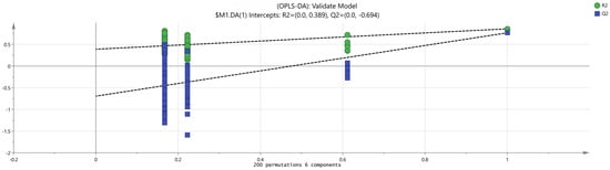 The data obtained from the principal component analysis underwent further processing and analysis. As depicted in Figure 6, in the orthogonal partial least squares discriminant analysis (OPLS-DA), the fitting index of the independent variable R2X was 0.9, the fitting index of the dependent variable R2Y was 0.817, and the model prediction index Q2 was 0.545; all were greater than 0.5, making the fitting results acceptable. To further confirm the model’s validity, 200 permutation analyses were conducted on the data. The results, presented in Figure 7, show that the intersection point of the regression line of Q2 and the vertical axis was less than 0, indicating that the model was effective, with no overfitting, and that the analysis was reliable and applicable.